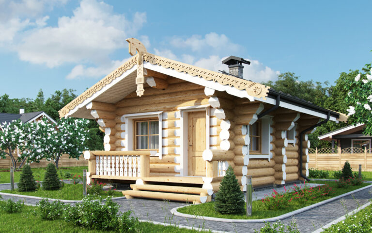 Проект одноэтажной бани из бревна в стиле рустик оптимально сочетает компактность размеров здания с продуманностью планировки вместительных помещений. Планировка бани предусматривает наличие просторной комнаты отдыха и парного блока, включающего парную и душевую. Входная группа организована с небольшого крытого крыльца. Размеры бани позволяют реализовать проект даже на очень маленьком дачном участке. Во всех помещениях (кроме душевой) предусмотрены окна, через которые в них проникает естественный свет, что позволяет сэкономить на электроэнергии. Среди преимуществ проекта следует также отметить возможность организации в комнате отдыха небольшого кухонного блока.